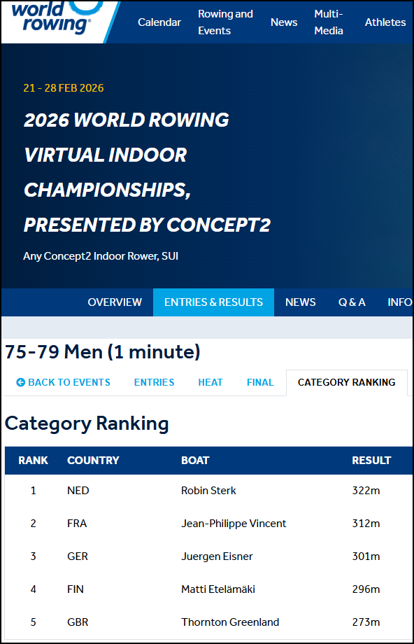 Robin Sterk (76, Nijman8) zich nu zelfs wereldkampioen mag noemen. Hij lag zo’n 45 seconden virtueel boord-aan-boord met een taaie Fransman, maar ging heel diep, hield stand en won met 10 meter voorsprong: 322 meter, oftewel 1:32.9/500. Alle tips en begeleiding die hij in de laatste maanden kreeg van coach Martin hebben dus aantoonbaar hun vruchten afgeworpen.