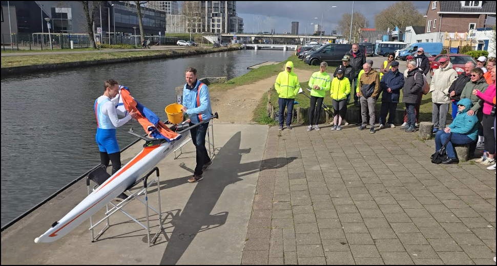 Op zaterdag 28 maart doopte Frank Vandewal onze nieuwe instructieskiff, de Hilver. Koen de Mare heeft de Hilver voorgeroeid.